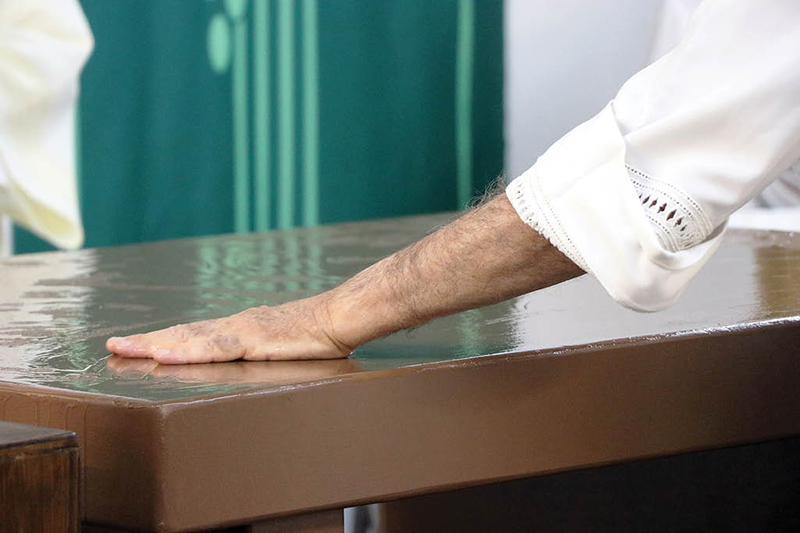 Then Bishop Silva said the Prayer of Dedication over the altar before taking off his outer vestments and putting on a white apron. With his sleeves rolled up, the bishop poured a generous amount of chrism oil over the altar and methodically rubbed the oil over its entire top surface. The oil marks the altar as a symbol of Christ, “the Anointed One.”