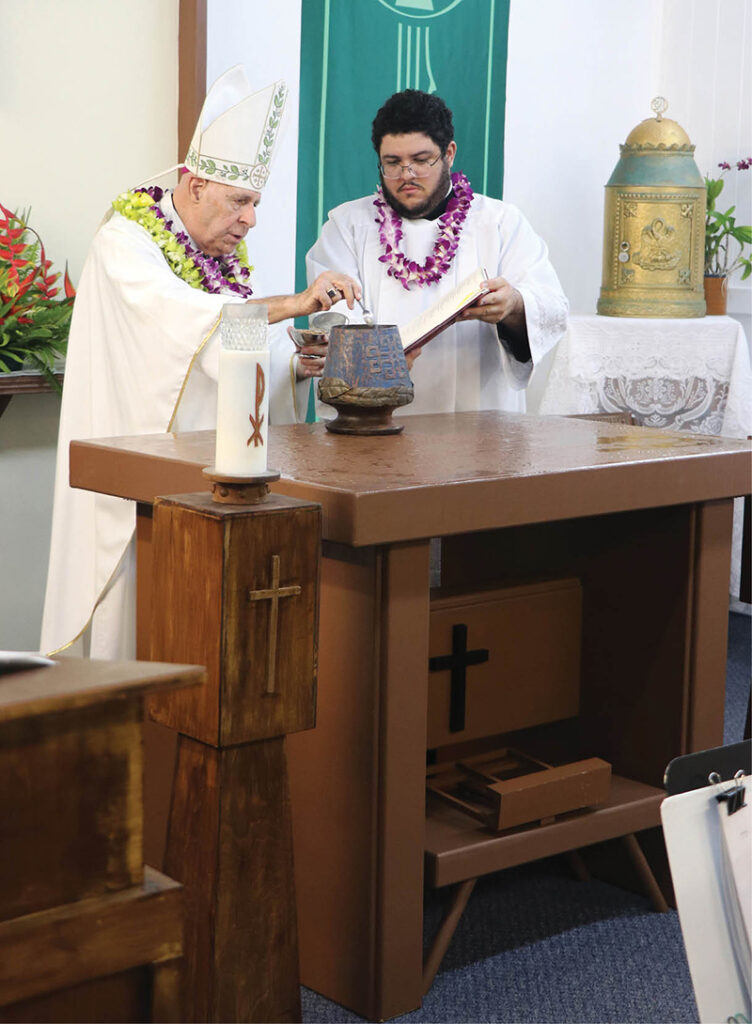In his homily, Bishop Silva spoke about the Hawaiian name for land divisions in the islands, ahupuaa. The name is a combination of “ahu” meaning altar and “puaa” meaning pig. The different divisions were centered around a sacrificial altar according to native Hawaiian tradition.