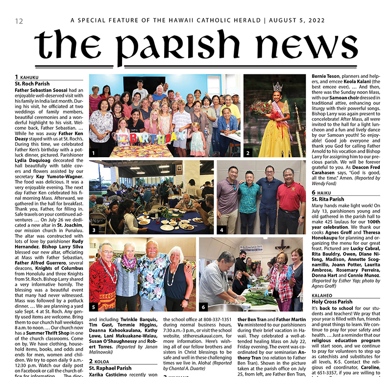 Hawaii Catholic Herald Parish News: Aug. 5, 2022 08/03/2022 by Hawaii Catholic Herald Click here to see pdf files of the Aug. 5, 2022, Parish News section.