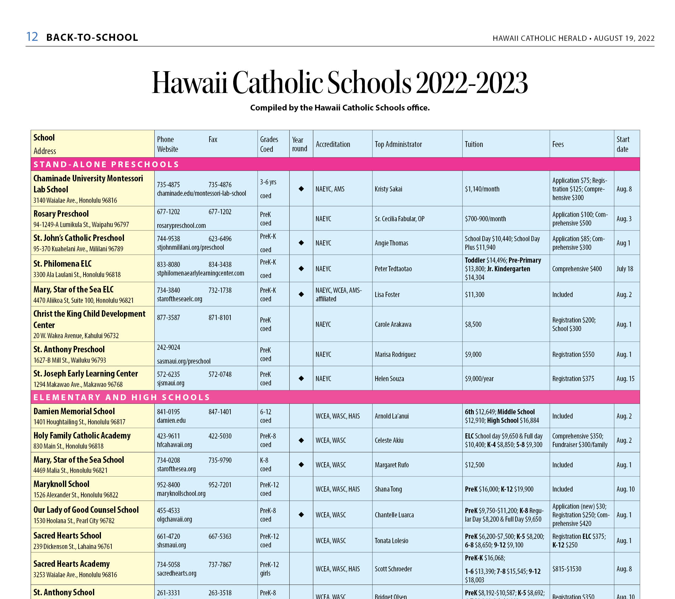 Back to School 2022: Schools Chart 08/17/2022 by Hawaii Catholic Herald Click here to see pdf of the 2022 schools chart.