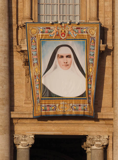 A banner showing St. Marianne Cope hangs from the facade of St. Peter’s Basilica for the canonization Mass for seven new saints led by Pope Benedict XVI in St. Peter’s Square at the Vatican Oct. 21, 2012. (CNS photo/Paul Haring )