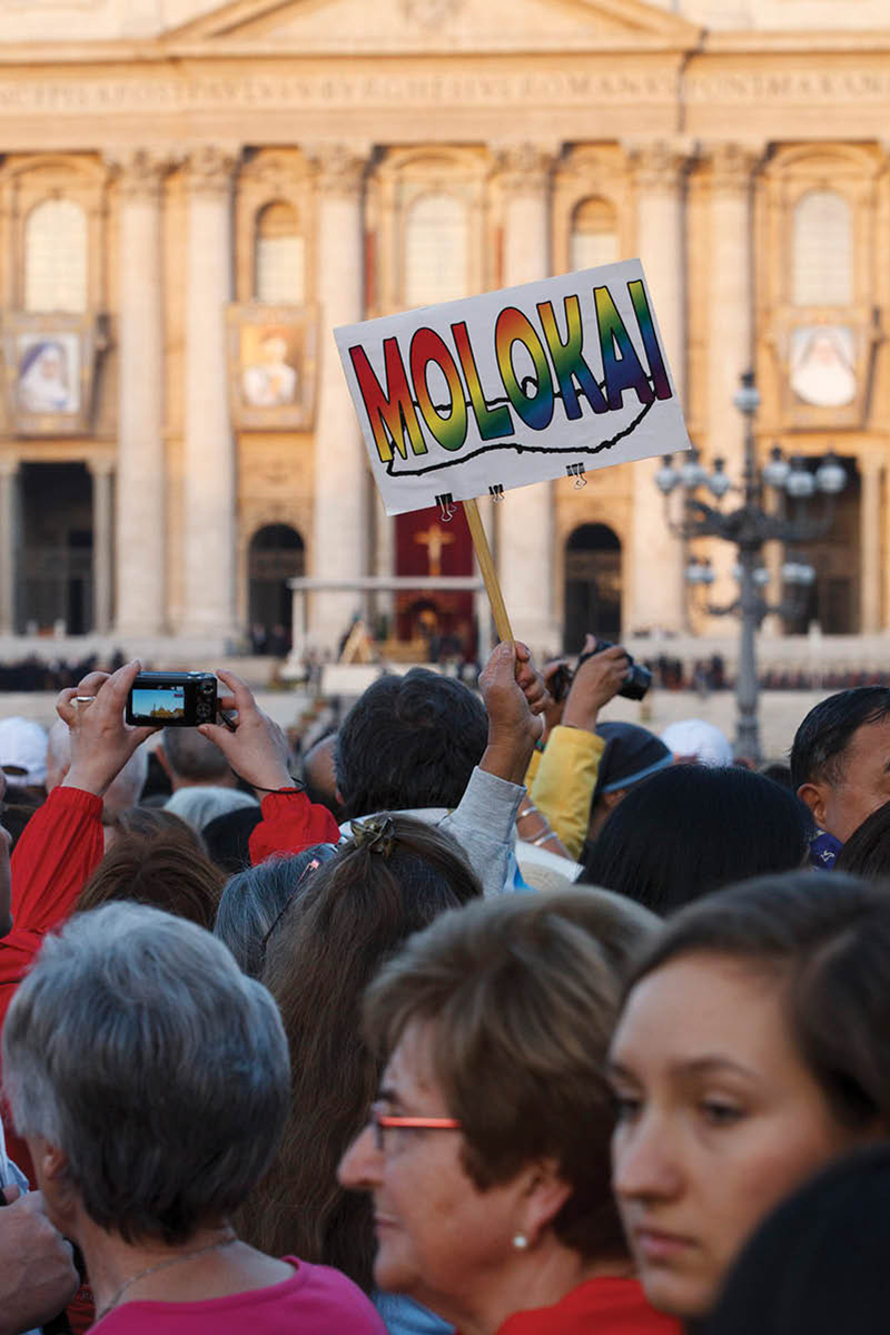 A pilgrim holds a sign with the word “Molokai” as pilgrims wait to enter the canonization Mass for seven new saints in St. Peter’s Square at the Vatican Oct. 21, 2012. Among the new saints declared by Pope Benedict XVI were two North Americans — St. Kateri Tekakwitha, an American Indian born in upstate New York who died in Canada in 1680, and St. Marianne Cope, who worked with leprosy patients on the Hawaiian island of Molokai. (CNS photo/Paul Haring)