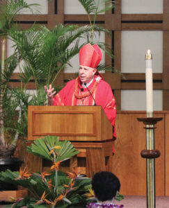Oahu Catholic School educators pray during the Mass of the Holy Spirit for the opening of the new school year Aug. 18 at St. Ann Church, Kaneohe. Below, Bishop Larry Silva gives his homily. (HCH photos | Anna Weaver)