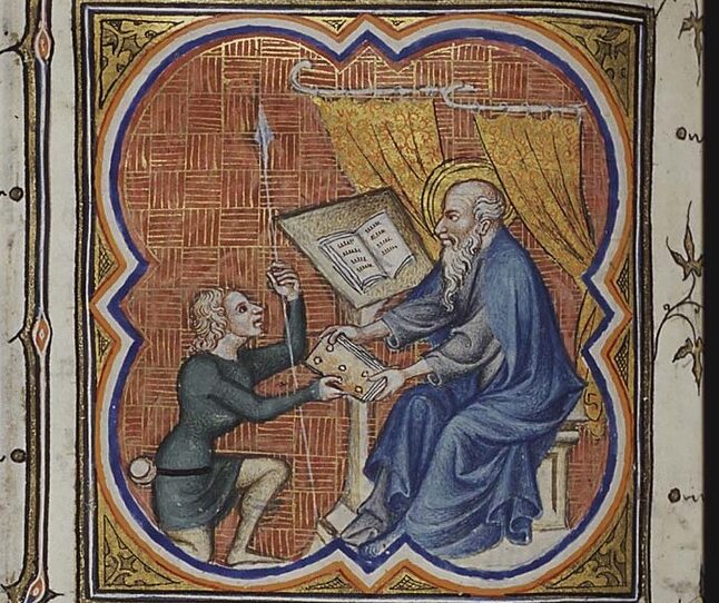 “St. Paul sends a letter to Philemon,” Illumination from The Master of the Bible of Jean de Sy, in the collection of the National Library of the Netherlands