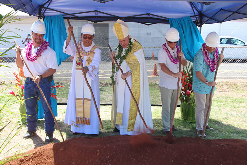 Armed with their Hawaiian o‘o digging sticks, officials symbolically break ground Aug. 20 for the new Our Lady of Perpetual Help Church in Ewa Beach. They are, from left, David Hubbard, president of Design Build Hawaii; Father Edmundo N. Barut, pastor of Our Lady of Perpetual Help; Bishop Larry Silva; David Pfeifer, principal/architect of Domus Studio Architecture; and Robert Woodring, senior project manager of Rider Levett Bucknall. At right, Father Barut addresses those who attended the ceremony. (Photo courtesy of Dann Ebina)