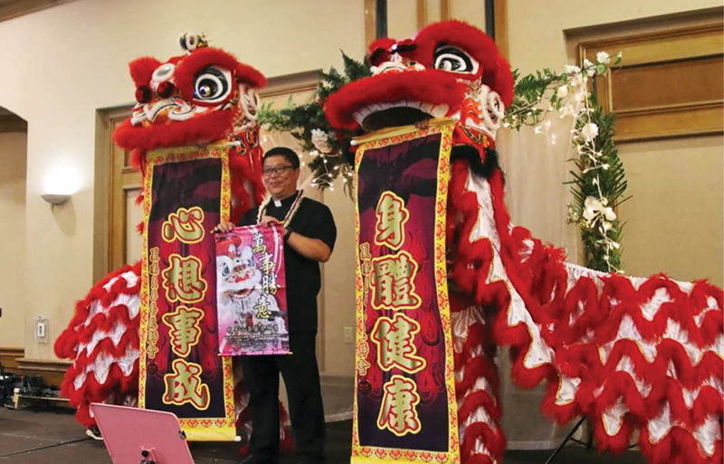 Dancing lions join fellow countryman Father Paul Li, pastor of St. Philomena, in a parish 80th anniversary salute. (Courtesy photo)