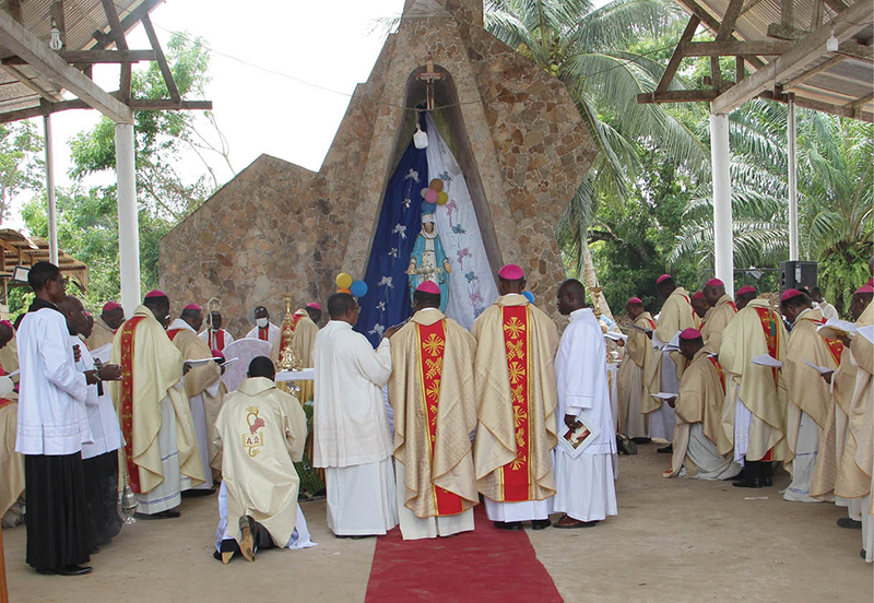 Cameroon’s bishops pray at the Marian shrine of Marienberg as they rededicate the country to the Immaculate Heart of Mary April 24, 2022. Catholic bishops in Cameroon’s war-torn English-speaking regions say they were left in “shock and utter horror” following the burning of a church and the kidnapping of five priests, a nun and at least two laypeople. (CNS photo/Ngala Killian Chimtom)