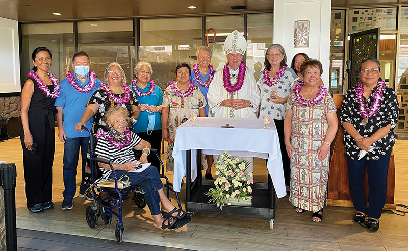 Bishop Larry Silva celebrated the Mass in the courtyard of St. Francis Healthcare campus. He was assisted by Deacon Jeff Calamayan. About 60 guests shared potluck dishes and fellowship. Sean Tiwanak, Gavin Kaina and Jeff Kahapea entertained.
