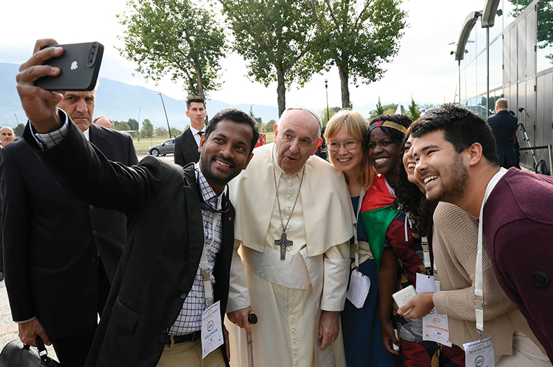 Pope Francis poses for a selfie during a meeting in Assisi, Italy, Sept. 24, 2022. The pope led a meeting with young economists, entrepreneurs, financial advisers, scholars and scientists who have been working for two years on the Economy of Francesco project. (CNS)