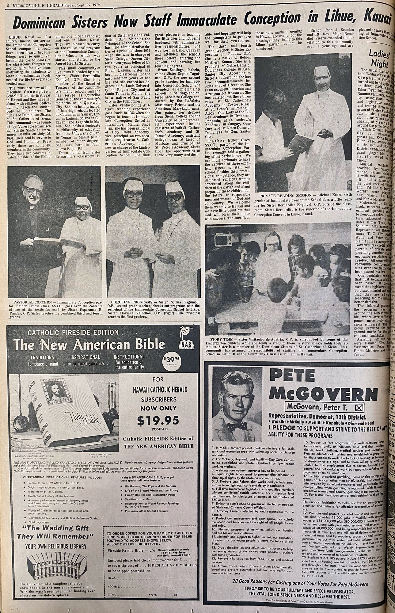 The nuns are new at Immaculate Conception School. It is their first year in Hawaii and they have set about with religious dedication to teach the student body of 107 children. The nuns are Dominican Sisters of St. Catherine of Siena. This community was founded by Venerable Francisca del Spiritu Santo at Intramuros Manila on July 26, 1696. Their goal is service to God and Humanity. Presently there are some 400 members in the community. They have two convents located outside of the Philippines, one in San Francisco and one in Lihue, Kauai.