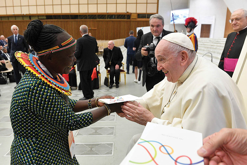 Pope Francis greets Tegla Loroupe, a Kenyan long-distance runner and advocate for inclusion in sports, at the “Sport for All” summit in the Vatican audience hall Sept. 30, 2022. (CNS photo/Vatican Media)