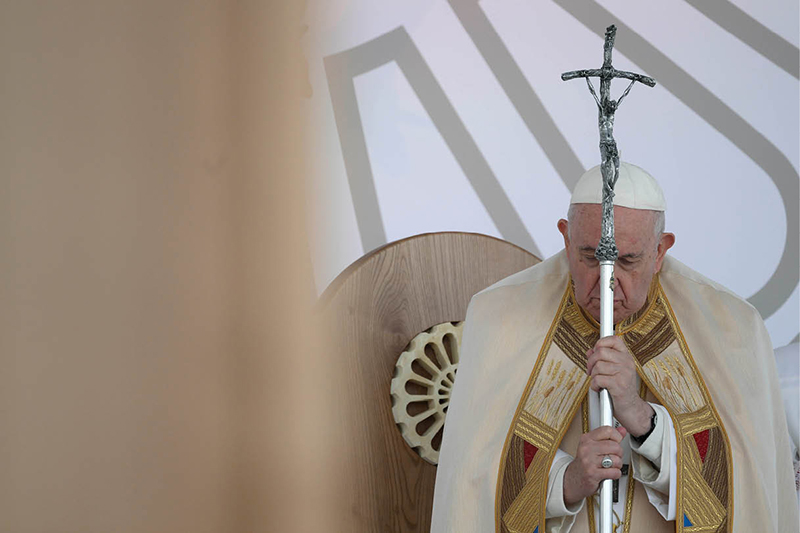 Pope Francis holds his crosier as he celebrates the closing Mass of Italy’s National Eucharistic Congress at the municipal stadium in Matera, Italy, Sept. 25, 2022. (CNS photo/Vatican Media)