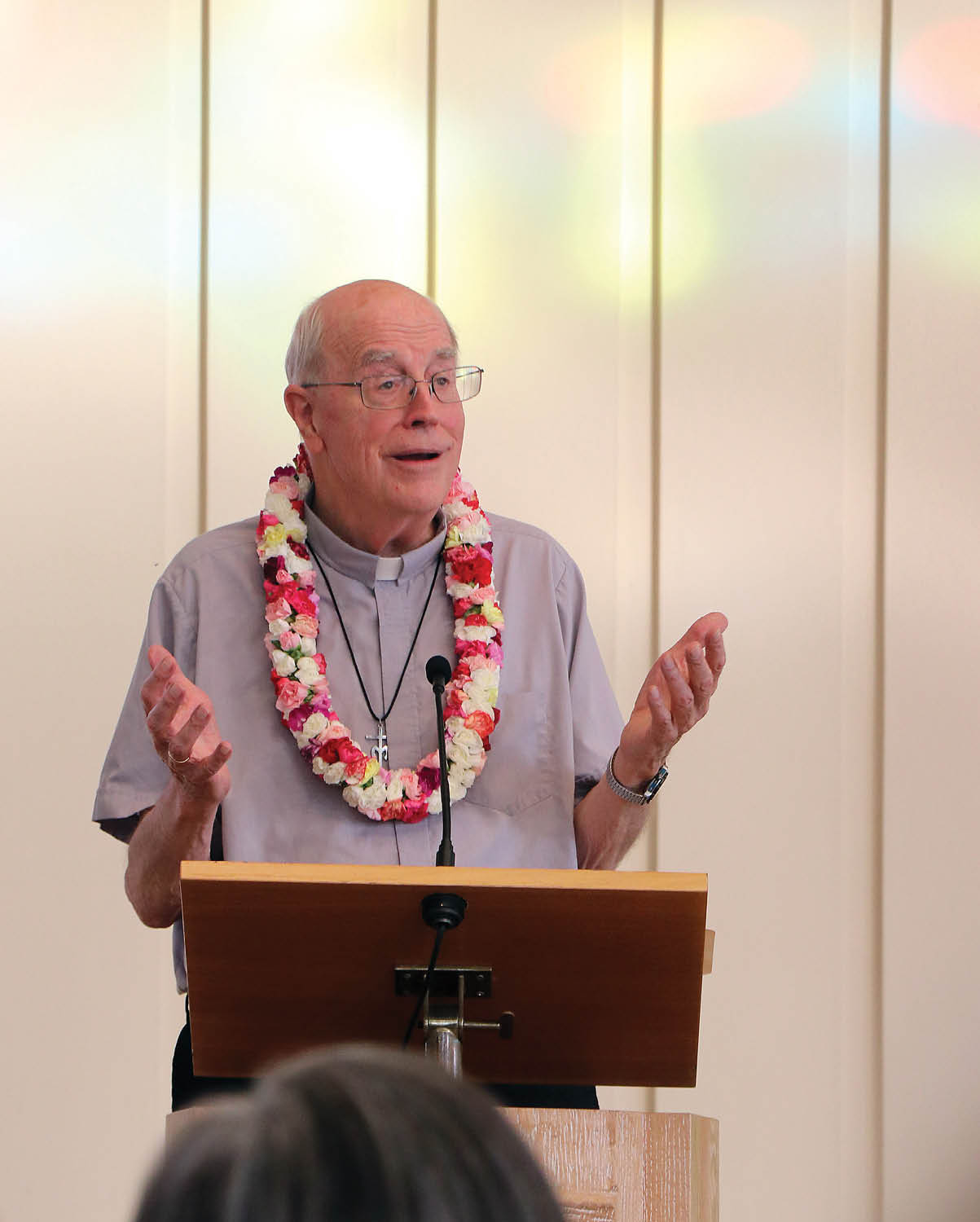 Marianist Father James L. Heft speaks at the Mystical Rose Oratory at Chaminade University of Honolulu on Oct. 9. (HCH photo | Anna Weaver)