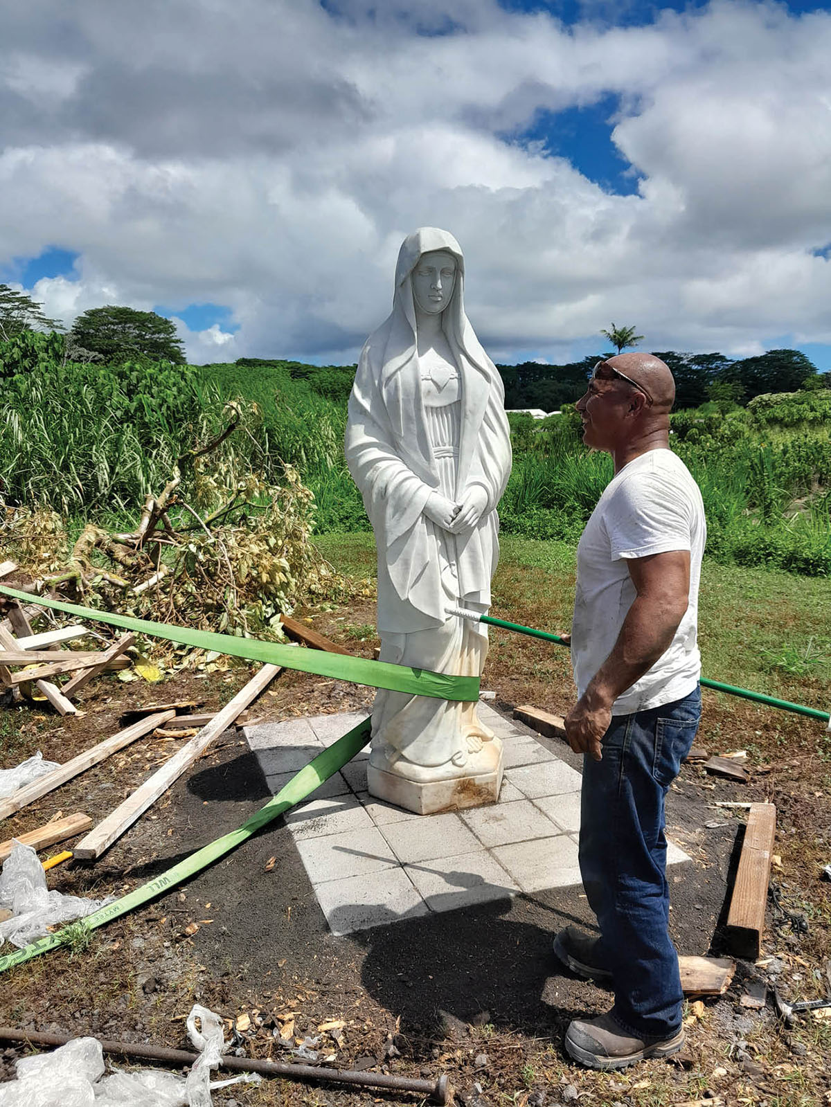 A volunteer helps mount the statue of Our Lady of Sorrows in the Sacred Heart Parish cemetery in Pahoa of the Big Island on Oct. 5. (Photo courtesy of Deacon Jim Dougherty)