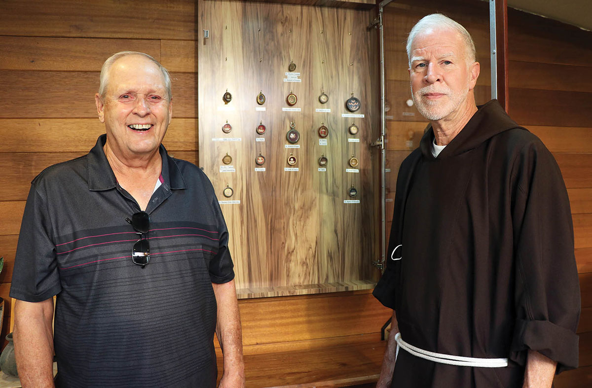 Bob White and Capuchin Franciscan Father Michel Dalton stand in front of the new reliquary at Holy Trinity Church in Kuliouou. (HCH photos | Anna Weaver)