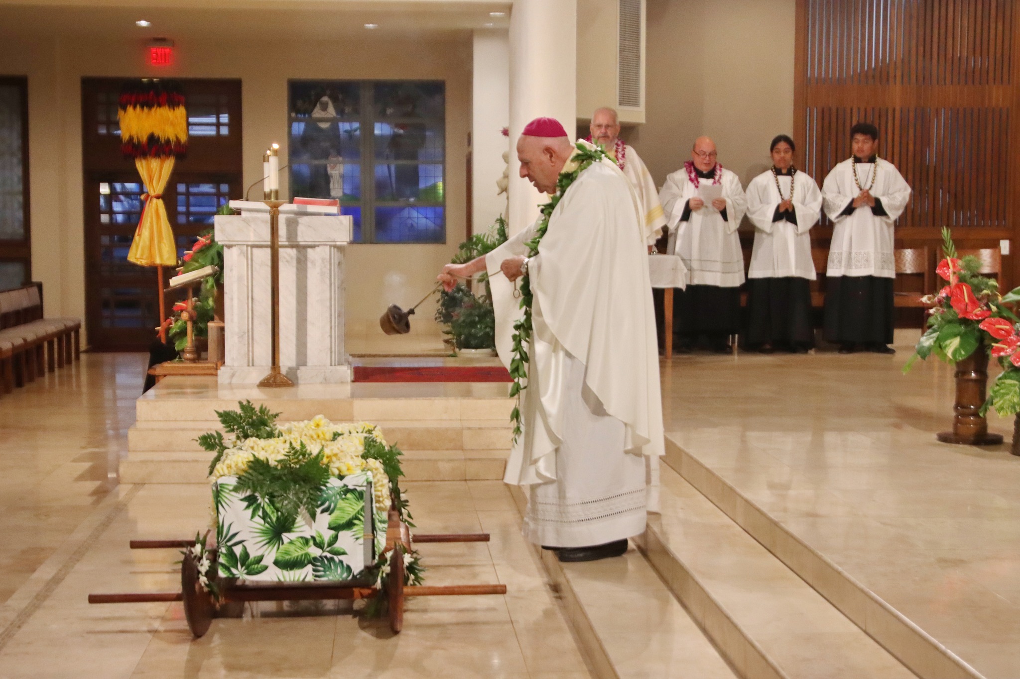 Bishop Larry Silva blesses the relics of St. Marianne Cope at the Mass celebrating her 10th anniversary of canonization. The Mass was held Oct. 25, 2022, at the Co-Cathedral of St. Theresa in Honolulu. (Photo: Dann Ebina)
