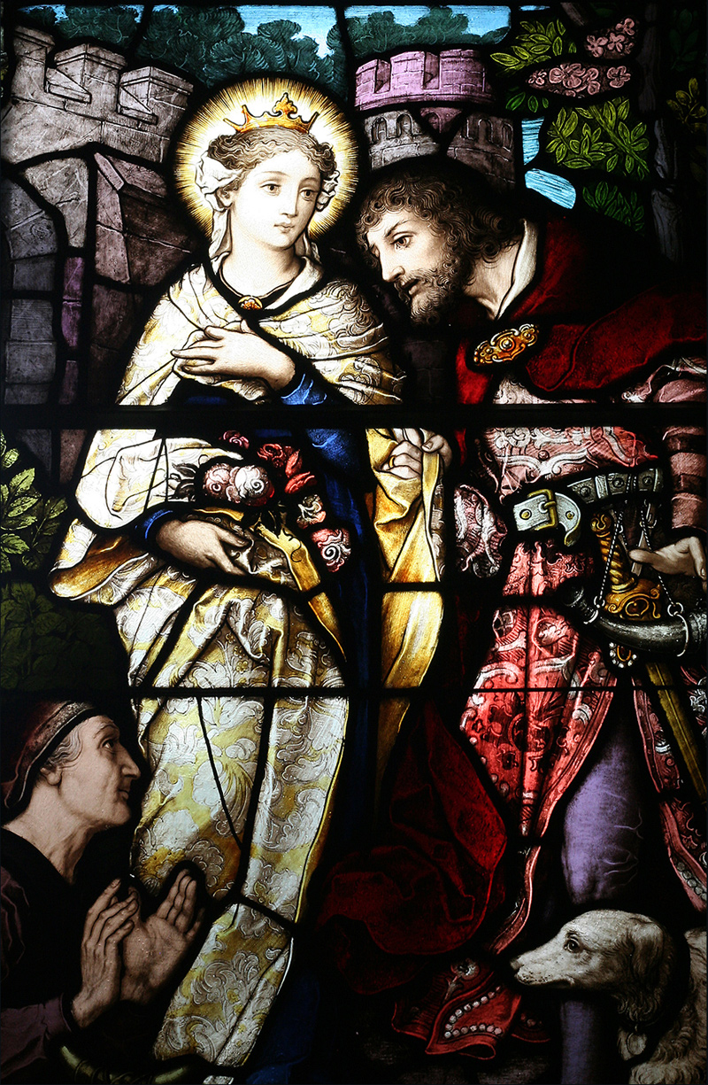 A stained-glass window in St. Patrick Basilica, Ottawa of St. Elizabeth of Hungary and Ludwig IV of Thuringia. Workshop of Franz Borgias Mayer. Photo: Wojciech Dittwald. (CC via Wikimedia)