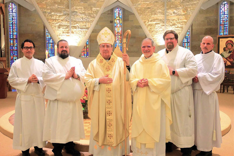 Honolulu seminarian John Akau and three others were installed in the ministry of acolyte Oct. 26 at Sacred Heart Seminary and School of Theology, in Hales Corners, Wisconsin. Pictured from left, are Akau, Dan Christe (Diocese of Saginaw), Archbishop Christophe Pierre, apostolic nuncio to the United States, and presider, Father Raul Gomez-Ruiz, president-rector of Sacred Heart Seminary, Daniel Dunn (Diocese of Springfield-Cape Girardeau) and Randy Recker (Diocese of Pensacola-Tallahassee). (Photo courtesy of Sacred Heart Seminary and School of Theology)