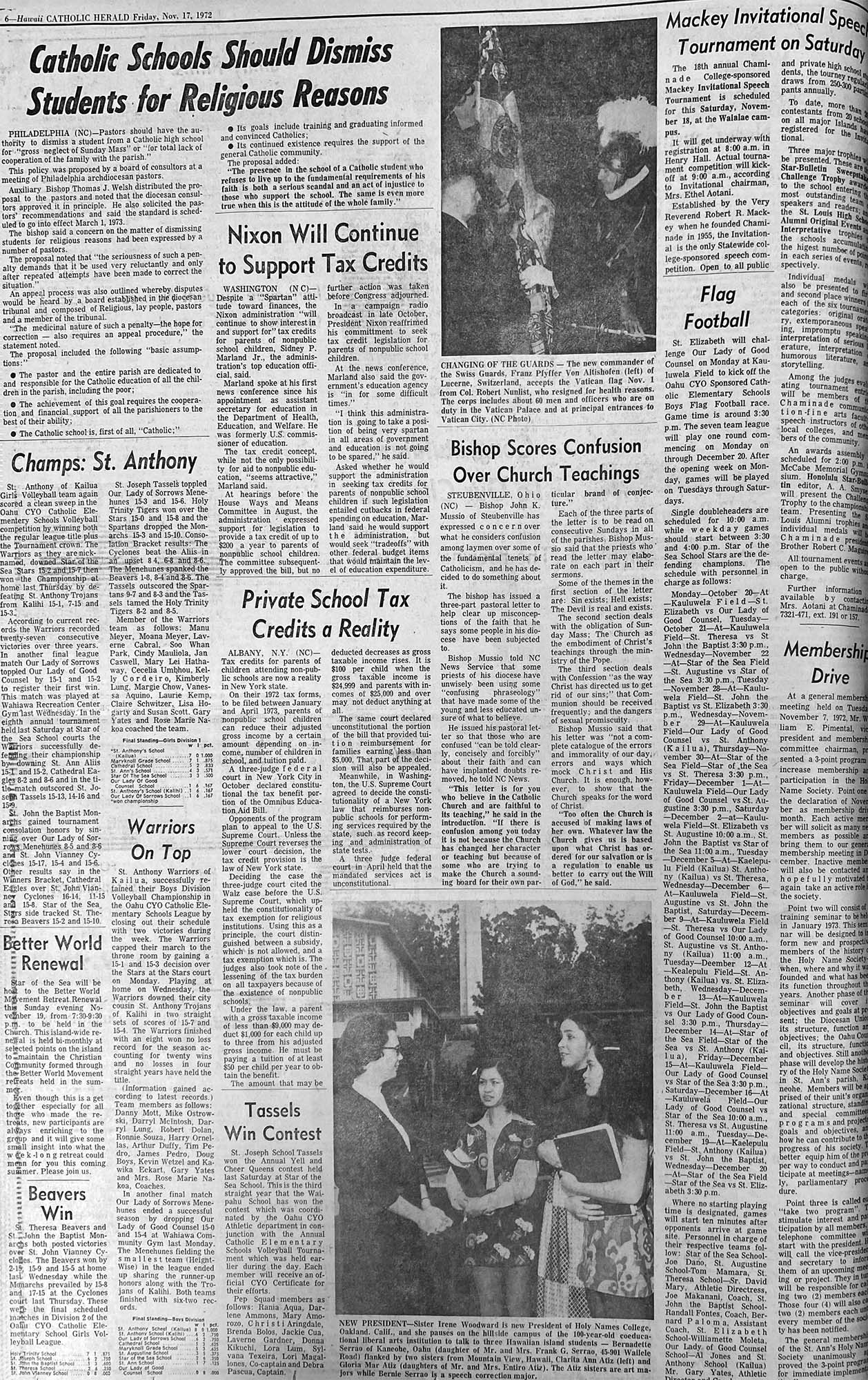 NEW PRESIDENT — Sister Irene Woodward is the new President of Holy Names College, Oakland, Calif., and she pauses on the hillside campus of the 100-year-old coeducational liberal arts institution to talk to three Hawaiian island students — Bernadette Serrao of Kaneohe, Oahu (daughter of Mrs. and Mrs. Frank Serrao) flanked by two sisters from Mountain View, Hawaii, Clarita Ann Atiz (left) and Gloria Mar Artiz (daughters of Mrs. and Mrs. Entiro Atiz). The Atiz sisters are art majors while Bernie Serrao is a speech correction major.