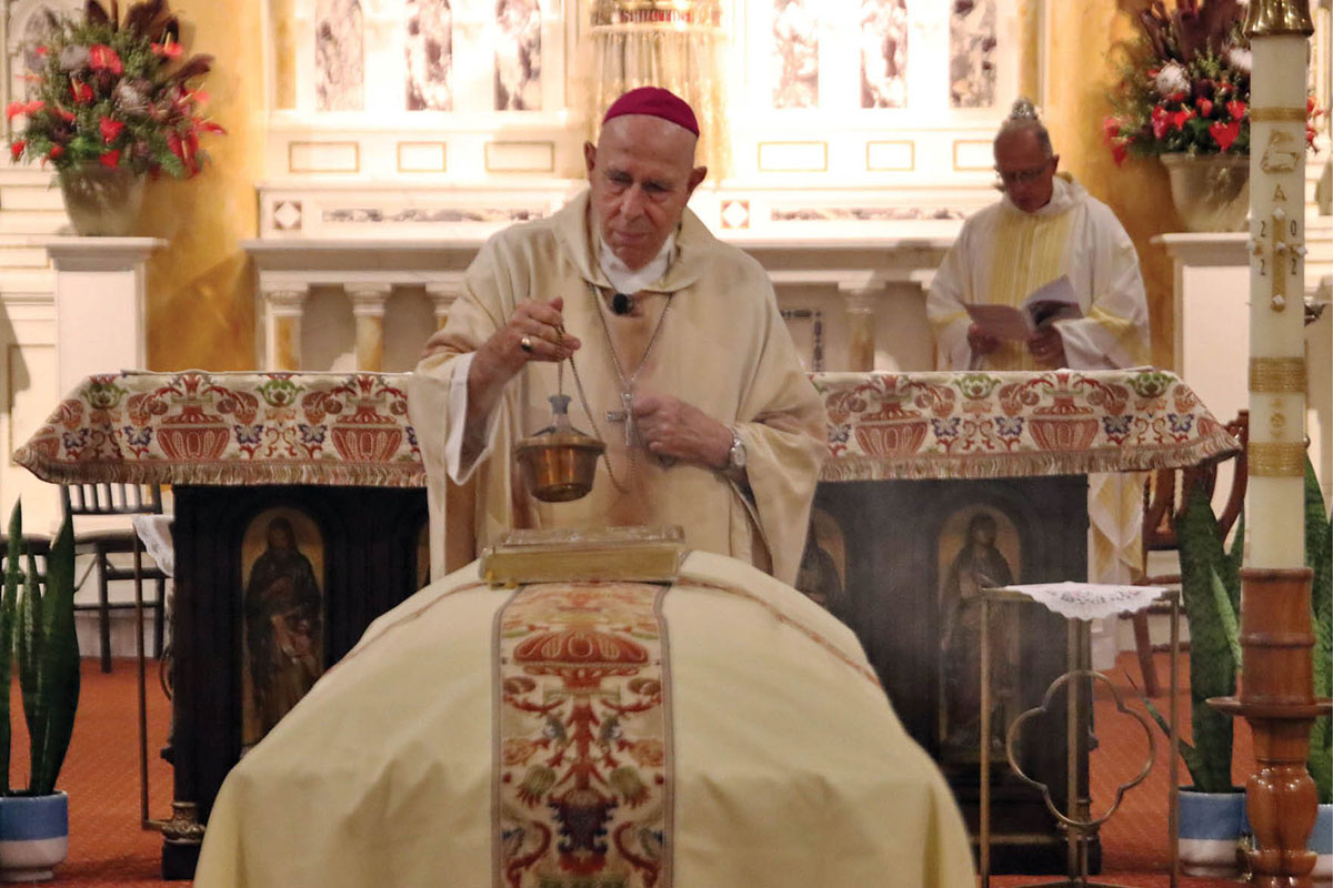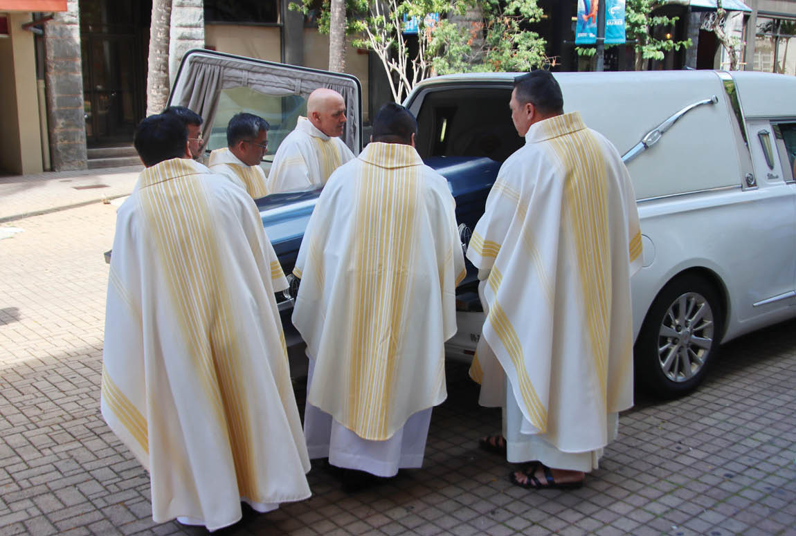 Above, Bishop Larry Silva blesses the casket of Father Louis “Harry” Yim during his funeral Mass Nov. 2 in the Cathedral Basilica of Our Lady of Peace. Father Yim, the former diocesan archivist and historian, died Oct. 13 in Honolulu at age 93. Left, Father Yim’s pallbearers, priests all, place the deceased’s casket into the hearse for transport to Hawaiian Memorial Park in Kaneohe where he was buried. (Photos courtesy of Dann Ebina)