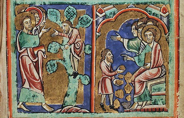 Jesus calls out to Zacchaeus in a tree (in image on left). From a 13th-century manuscript in the National Library of the Netherlands’ collection.
