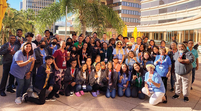 Hawaii delegates to the National Catholic Youth Conference in Long Beach, California, Nov. 10-12, gather for a pre-flight photo with Bishop Larry Silva. Fifty-seven from Hawaii attended the event. Bishop Silva was the main celebrant for Mass on Nov. 11. His homily was “Fantastic!” said Lisa Gomes, director of Youth and Young Adult Ministry for the Diocese of Honolulu, who also attended. He also led eucharistic adoration for vocations on Friday, played jun ken po (rock, paper, scissors) at the Hawaii delegation gathering, and stayed up late hanging out in the hotel lobby with the youth. “He was a champ!” said Gomes.