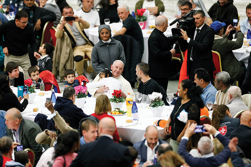 Pope Francis joins some 1,300 guests for lunch in the Vatican audience hall on the World Day of the Poor Nov. 13, 2022. (CNS photo/Remo Casilli, Reuters)