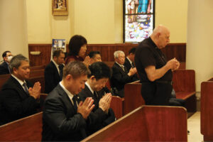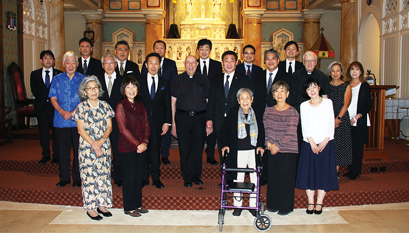 Bishop Larry Silva, center, poses with delegates from the World Federation Japan Religious Committee on Dec. 6 in the Cathedral Basilica of Our Lady of Peace. The group was in Hawaii on their annual pilgrimage to pray for world peace while participating in Pearl Harbor memorial services. Members of Hawaii’s Japanese Catholic Community were also present with their chaplain, Sacred Hearts Father James McDonough, and Marianist Brother Robert Maruyama. The former chaplain, the late Marianist Father Francis Nakagawa, forged a special friendship between the Hawaii community and the visiting organization, which is made up of ancient Shinto shrines, Buddhist temples, Christian churches and other inter-religious institutions. This federation has also received recognition from the United Nations for their dedication and commitment toward world peace. (HCH photo | Patrick Downes)