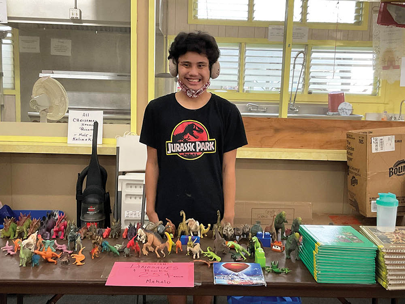Josiah Riedel-McKeen displays dinosaurs from his personal collection for sale at the garage sale fundraiser for Malia Puka O Kalani Parish in Keaukaha on the Big Island. Josiah, 17, a student at Hilo High School, is the son of Robyn Riedel, parish pastoral council chairperson, and Greer “Baba” McKeen, parish stewardship committee chairperson. He has been a dinosaur collector since age 3. The event was held in the parish hall, which was built in 1934 by community members under the care and direction of the Sacred Hearts Fathers. The parish is situated on Hawaiian Homes Land. The money raised will benefit the parish. (Photo courtesy of Gwen DeCoito)