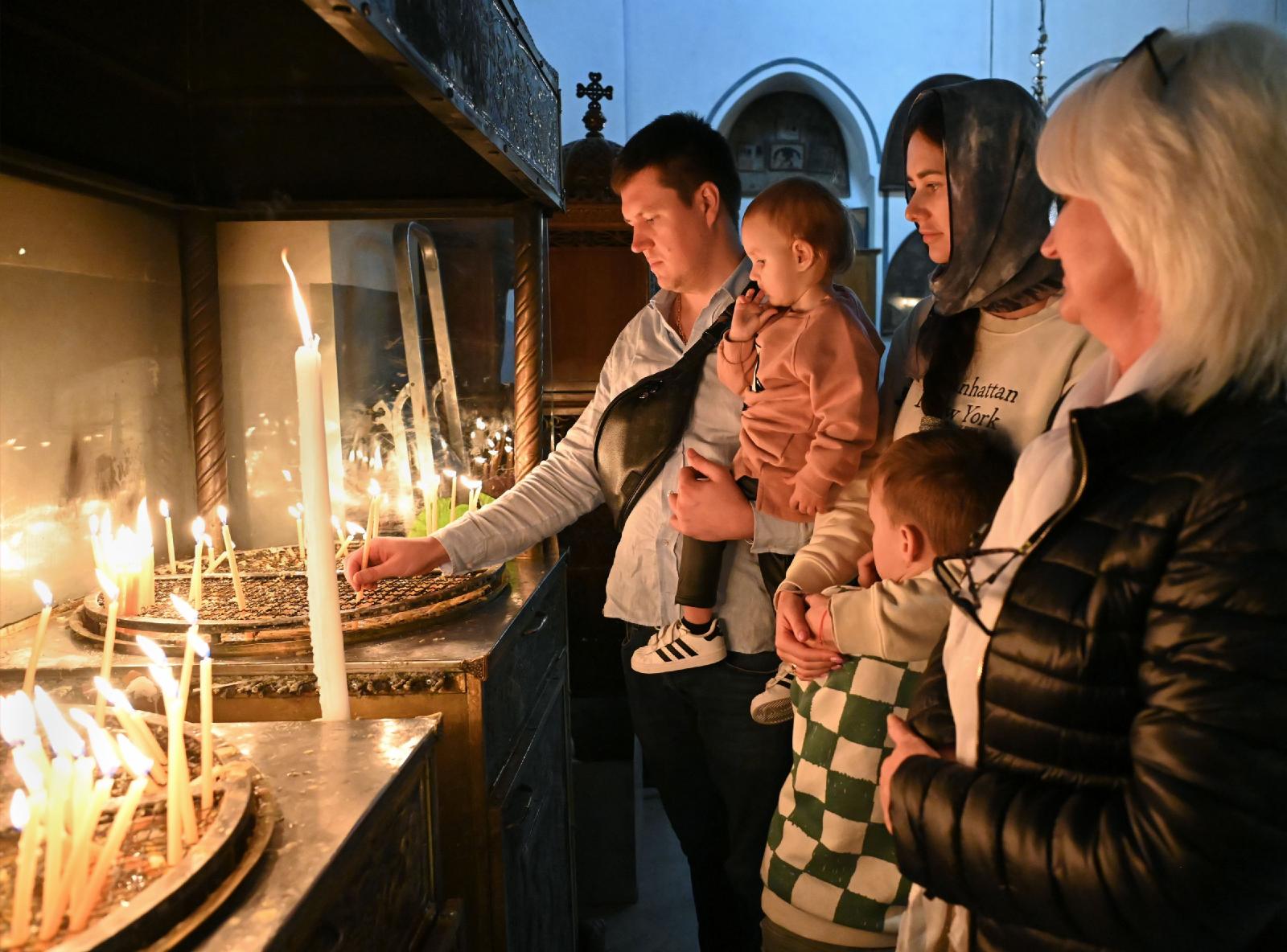 Alexander Hubenko from Ukraine holds his 15-month-old daughter, Amalia, 15, as he lights a candle in the grotto of the Church of the Nativity in Bethlehem, West Bank, Dec. 15, 2022. The church is built on what is believed to be the site where Jesus was born. (CNS photo/Debbie Hill)