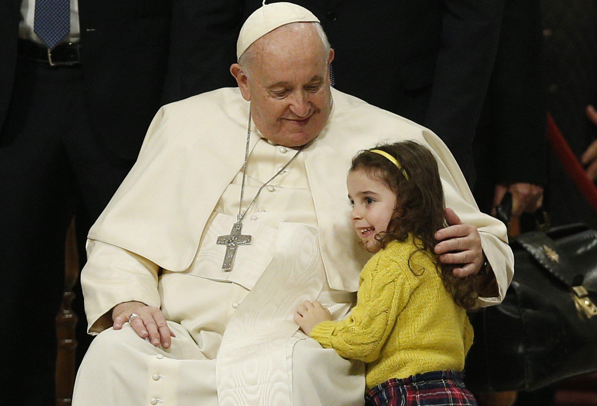 Pope Francis embraces a child as he arrives to lead a traditional evening prayer service on New Year’s Eve in St. Peter’s Basilica at the Vatican Dec. 31, 2022. Retired Pope Benedict XVI died in the morning Dec. 31 at his residence at the Vatican. He was 95. (CNS photo/Paul Haring)