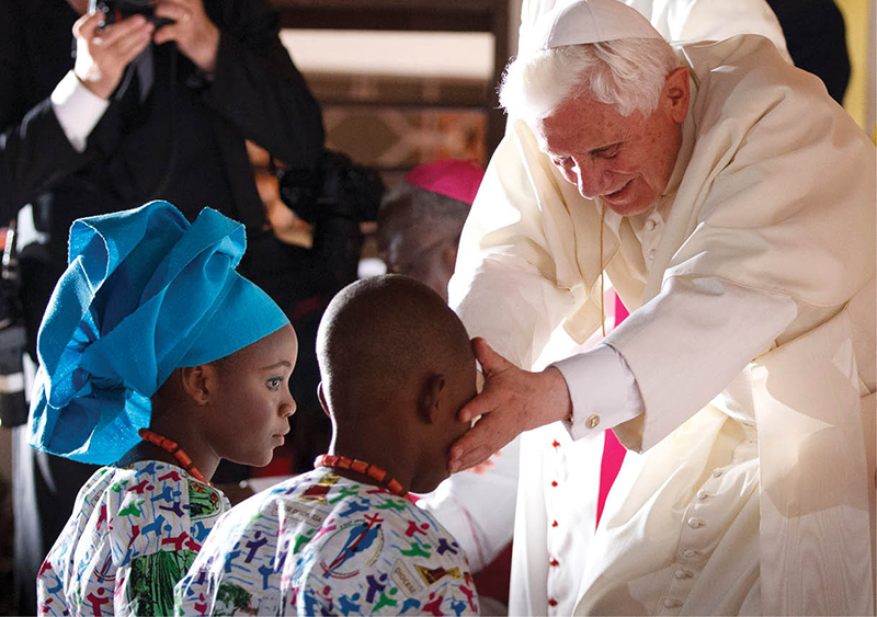Pope Benedict greets youths at the Missionaries of Charity Peace and Joy Center in Cotonou, Benin, Nov. 19, 2011. (CNS photo/Paul Haring)