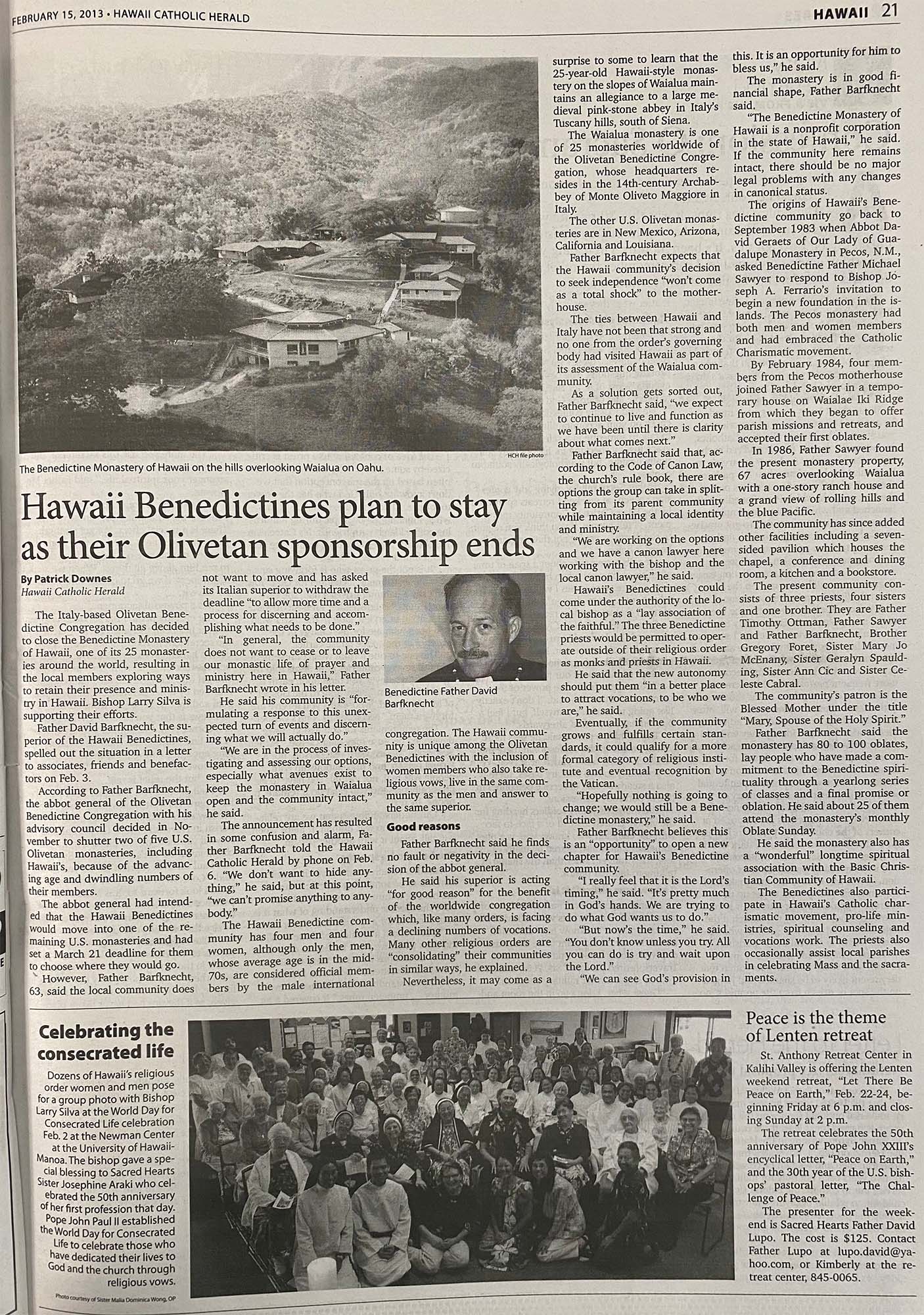 The Italy-based Olivetan Benedictine Congregation has decided to close the Benedictine Monastery of Hawaii, one of its 25 monasteries around the world, resulting in the local members exploring ways to retain their presence and ministry in Hawaii. Bishop Larry Silva is supporting their efforts.