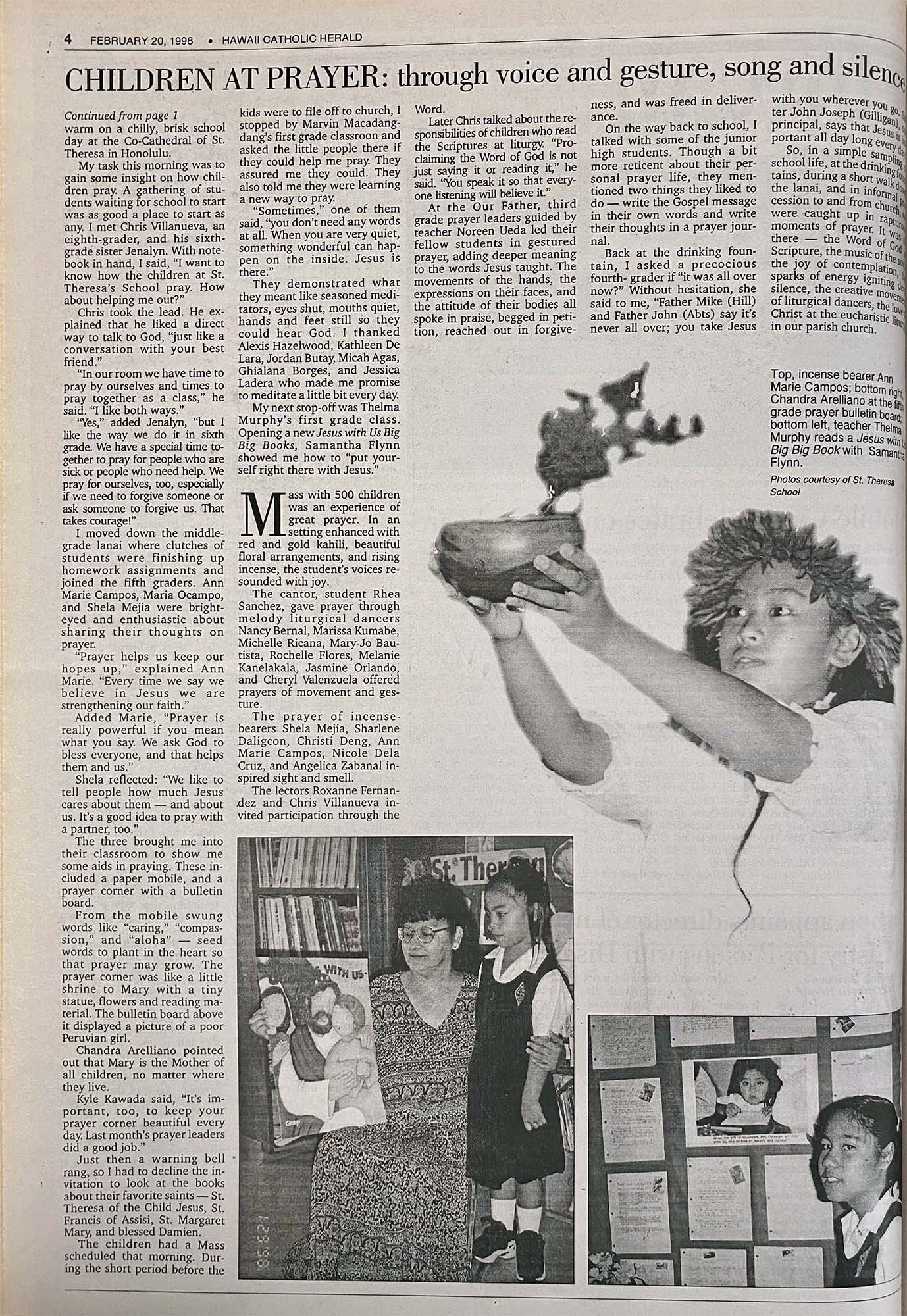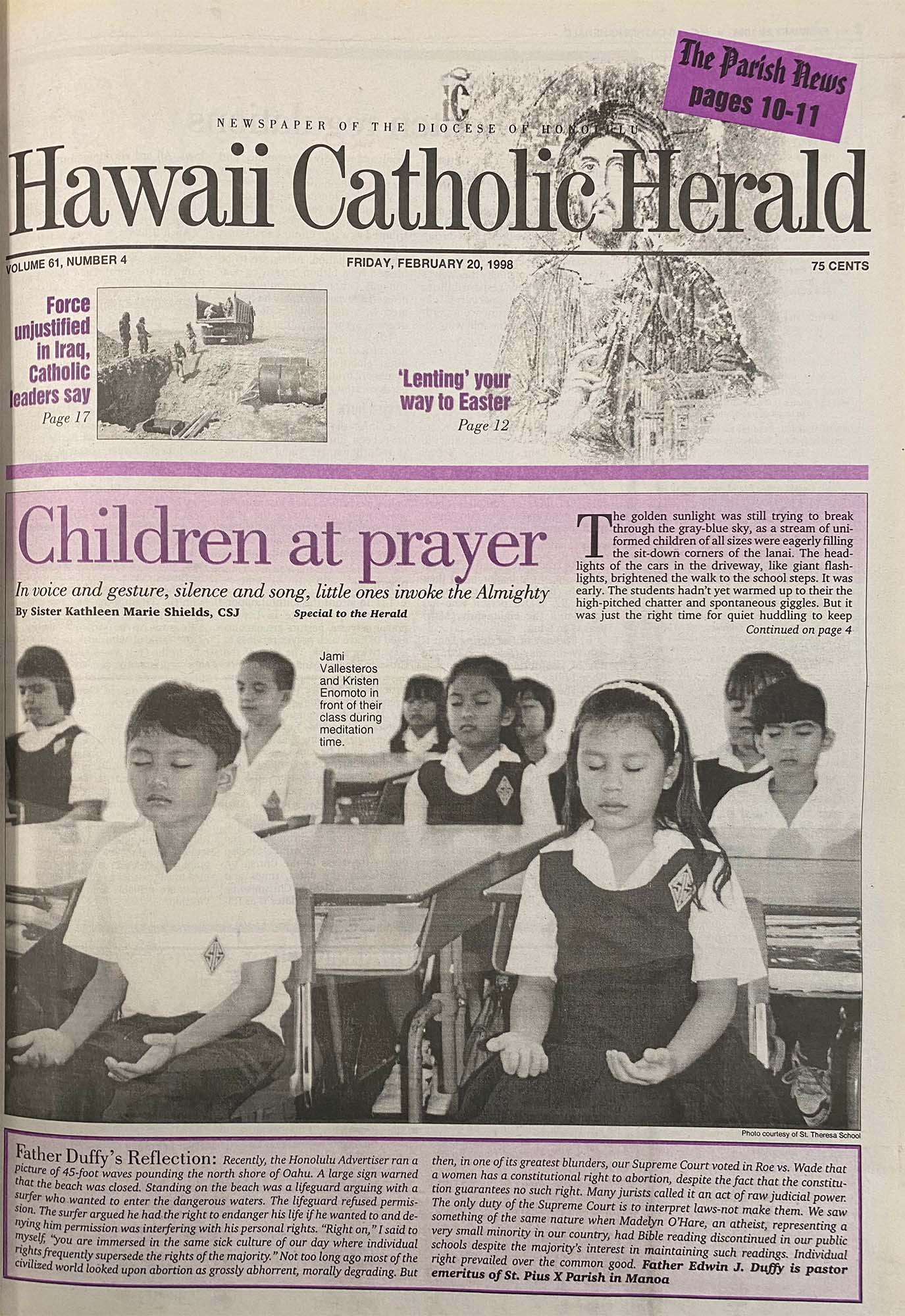 The golden sunlight was still trying to break through the gray-blue sky, as a stream of uniformed children of all sizes were eagerly filling the sit-down corners of the lanai. The headlights of the cars in the driveway, like giant flashlights, brightened the walk to the school steps. It was early. The students hadn’t warmed up to their high-pitched chatter and spontaneous giggles. But it was just the right time for quiet huddling to keep warm on a chilly, brisk school day at the Co-Cathedral of St. Theresa in Honolulu.