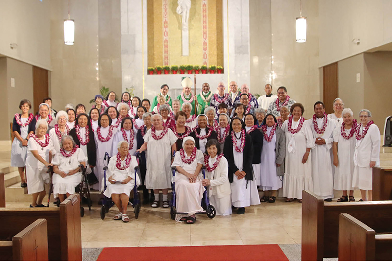 Religious sisters, brothers and priests pose for a group photo following Mass celebrated by Bishop Larry Silva at the Co-Cathedral of St. Theresa in commemoration of the World Day of Prayer for Consecrated Life Feb. 4. In 1997 St. John Paul II instituted a day of prayer for women and men in consecrated life attached to the Feast of the Presentation of the Lord on Feb. 2, also known as Candlemas Day, the day candles are blessed symbolizing Christ, the light of the world. So too are those in consecrated life called to reflect the light of Jesus Christ to all peoples. The celebration of World Day for Consecrated Life is transferred to the following Sunday, this year Feb. 4-5, in order to highlight the gift of consecrated persons for the whole church. (Photo courtesy of Dann Ebina)