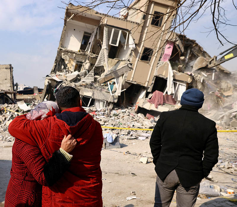 A wife and husband embrace outside of their destroyed home in Kahramanmaras, Turkey, Feb. 10, 2023. A powerful 7.8 magnitude earthquake rocked areas of Turkey and Syria early Feb. 6, toppling hundreds of buildings and killing thousands. (OSV News photo/Ronen Zvulun, Reuters)