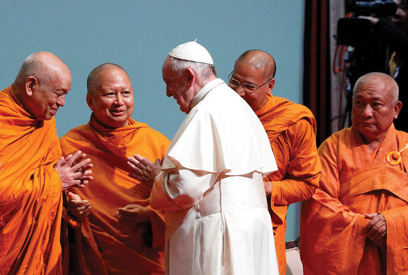 Pope Francis greets religious leaders during a meeting with Christian leaders and the leaders of other religions at Chulalongkorn University in Bangkok, Thailand, Nov. 22, 2019. (CNS photo/Paul Haring)