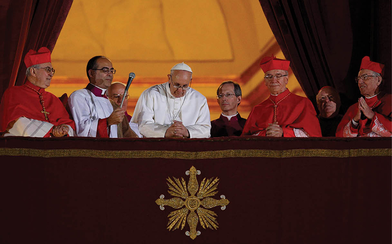 Pope Francis bows his head in prayer after his election, appearing on the central balcony of St. Peter’s Basilica March 13, 2013. The crowd joined the pope in silent prayer after he asked them to pray that God would bless him. (CNS photo/Paul Haring)
