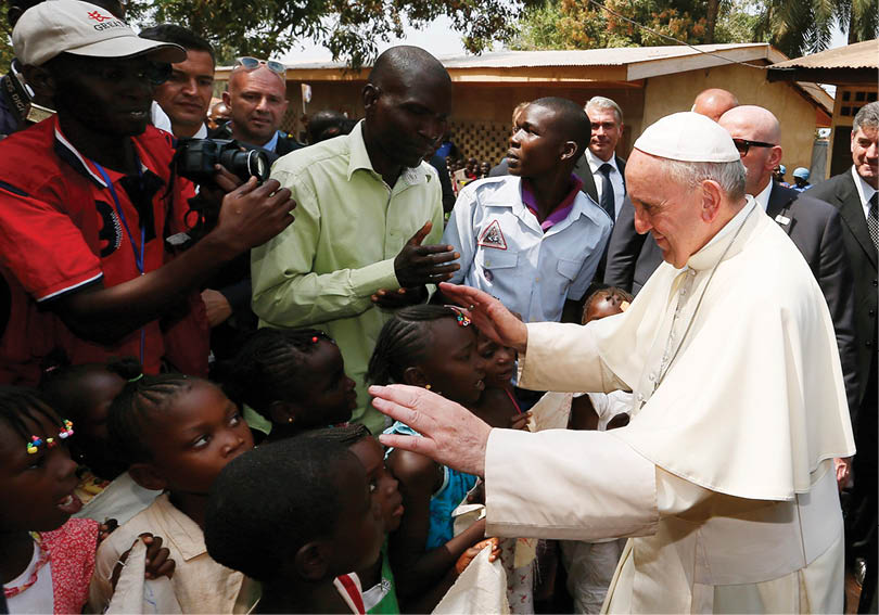 Pope Francis greets children as he visits a refugee camp in Bangui, Central African Republic, Nov. 29, 2015. (CNS photo/Paul Haring)