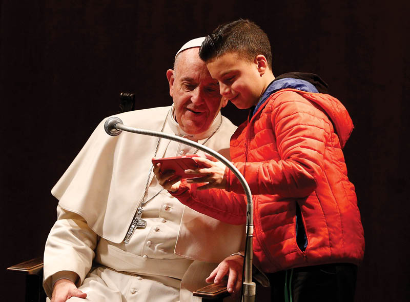A boy takes a selfie with Pope Francis as the pope meets children before celebrating Mass at St. Mary Josefa Parish in Rome Feb. 19, 2017. (CNS photo/Paul Haring)