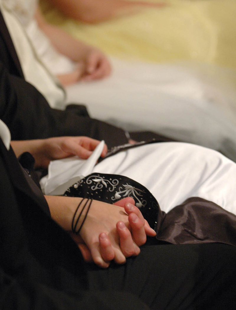 A file photo shows a couple holding hands during a late-night Mass at the Benedictine church in Peru, Ill. Catholic weddings have dropped 69% in 50 years in the U.S. and a larger dating crisis is helping to fuel the decline as it’s hard for single practicing Catholics to meet each other. (OSV News photo/CNS file, Nellie Williams, Catholic Post)
