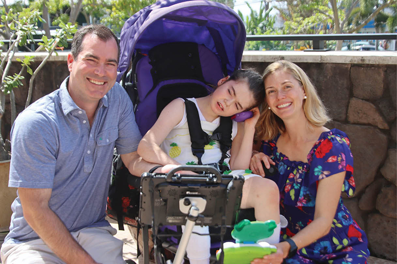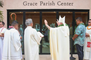 The Grace Parish Center of St. Michael the Archangel Parish in Kailua-Kona was blessed Feb. 23 by Bishop Larry Silva, right. The name of the center, which will house parish activities and ministries, is both a recognition of God’s blessings and a tribute to Grace Wilsey, pictured above with her parents, Kristen and Matt Wilsey, regular visitors to the Big Island parish. Grace, who was diagnosed in 2013 at age 4 with an extremely rare genetic disorder, has defied the odds and thrived. (Photos courtesy of Dann Ebina)