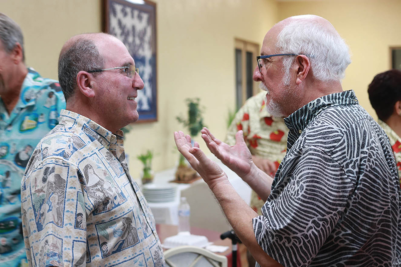 Deacon Jerry Tokars, right, of Kailua, Oahu, talks with Jesuit Father Phillip Chircop during the Diocese of Honolulu annual deacons’ retreat, Feb. 17-19, at St. Stephen Diocesan Center. Father Chircop led the retreat, the first in-person diaconate meeting since 2019. Seventy-six deacons and wives attended. (Photo courtesy of Deacon Keith Cabiles)