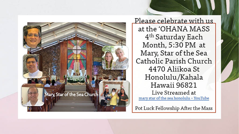 The pastor’s homily called all in the congregation to contribute their gifts by actively participating in the Mass as part of the parish’s Eucharistic Revival. Later, the community continued the breaking of bread at a potluck supper where all joyfully served each other with nourishing food and aloha, further revealing Christ’s face of God’s love. These “Ohana Masses” and potluck fellowship will continue on the fourth Saturday of each month, 5:30 p.m., at Mary, Star of the Sea where all are welcomed to celebrate and share their gifts as one Ohana.