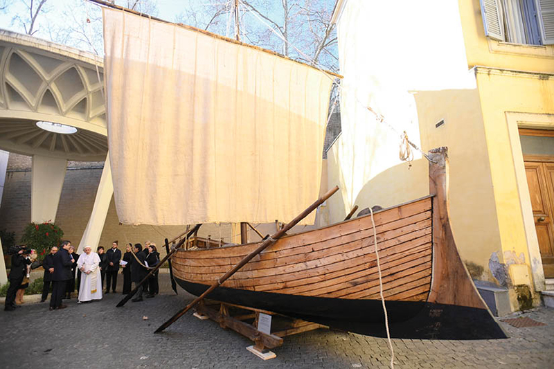 Outside the Vatican audience hall March 15, 2023, Pope Francis receives a replica of a first-century boat found in the Sea of Galilee in 1986. The replica, believed to be of the type used by Jesus and his disciples, was given to the pope by an Italian ferry company, Navigazione libera del Golfo, and the Rome-based International Diplomatic Institute. (CNS photo/Vatican Media)
