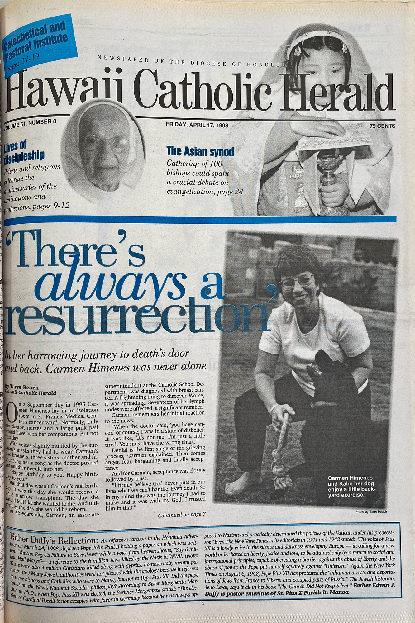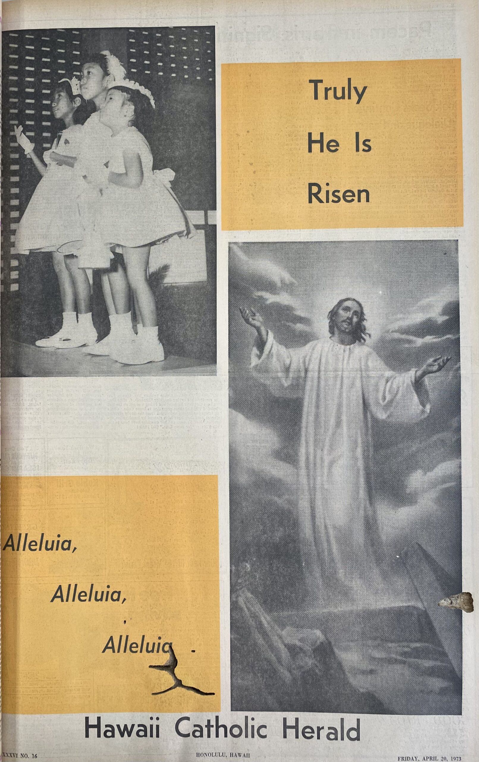 The 1973 Hawaii Catholic Herald Easter issue featured an image of the resurrected Jesus, the words, “Truly He Is Risen, Alleluia, Alleluia, Alleluia,” and a photo of these three first communicants.