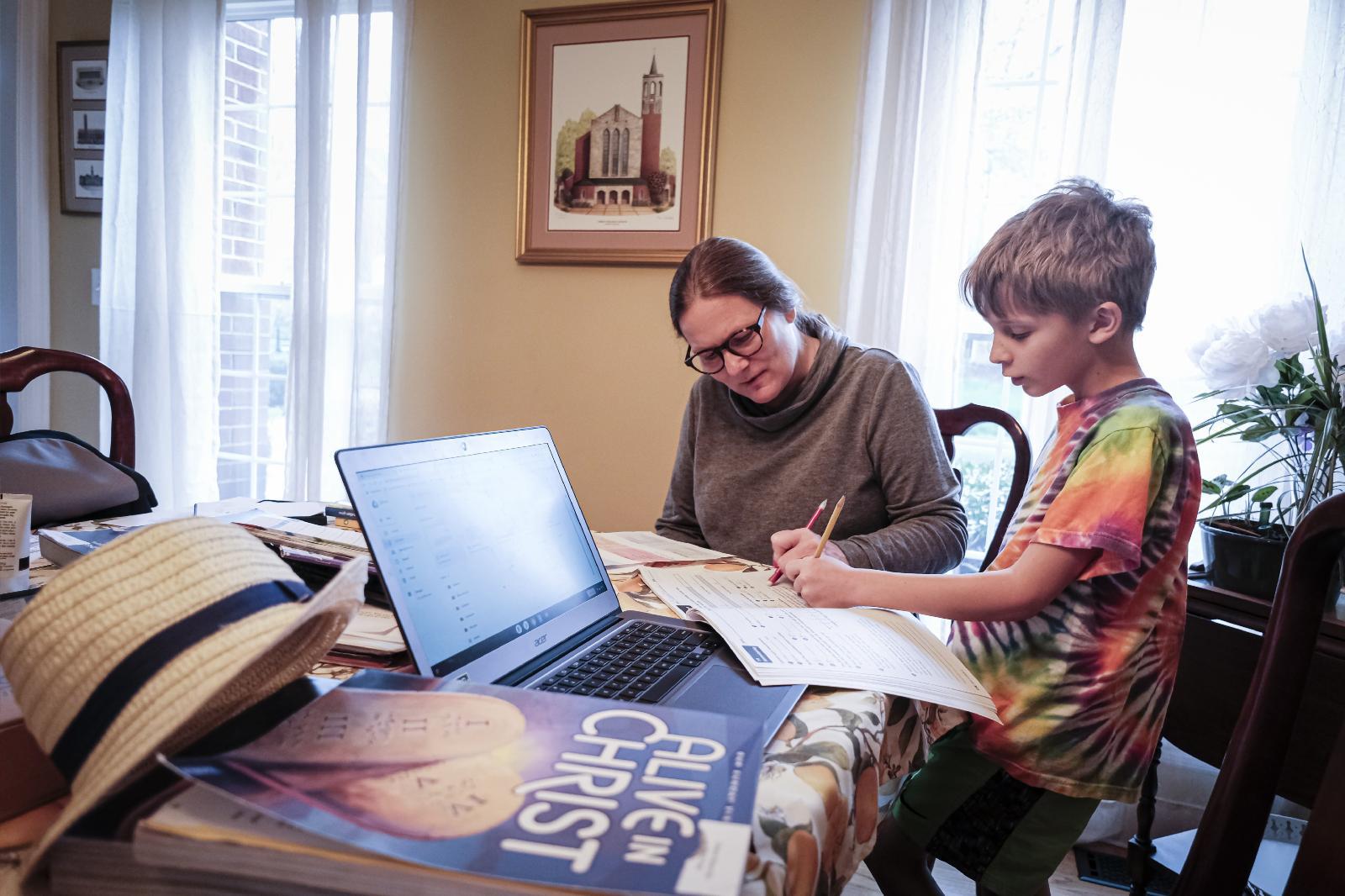 Karen Musacchio helps Christopher Musacchio, a fourth grader at Christ the King School in Nashville, Tenn., with his classroom assignments from home March 24, 2020. (CNS photo/Rick Musacchio, Tennessee Register)