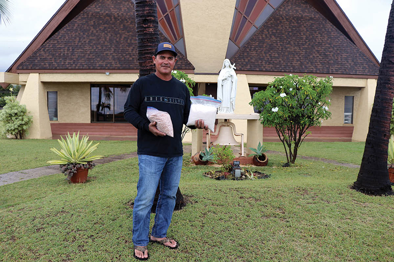 Outside of St. Theresa Church in Kekaha, Rowen Yorkman holds two bags of Hanapepe salt he and his family harvested. (Photo courtesy Yorkman family)