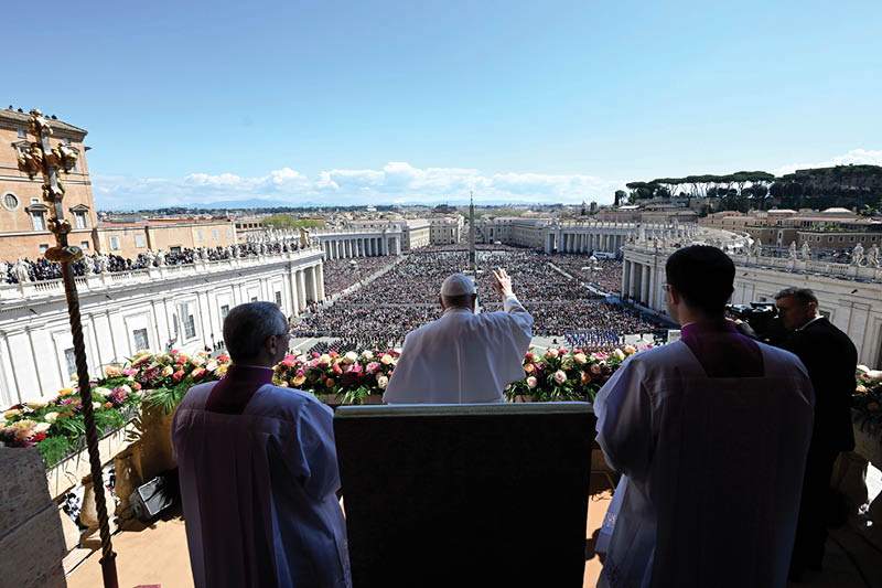 Pope Francis waves to the crowd in St. Peter’s Square before he imparts his Easter blessing “urbi et orbi” (to the city and the world) from the central balcony of St. Peter’s Basilica April 9, 2023. (CNS photo/Vatican Media)
