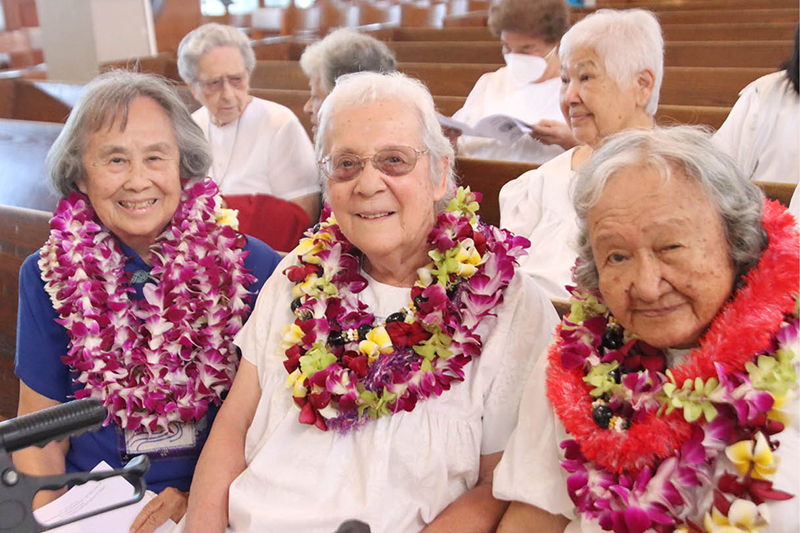 Wearing leis of appreciation, are jubilarians, from left, Sister Ann Faber Chang, CSJ; Sister Dolores Marie Pavao, SSCC; and Sister V. Herman Julia Aki, SSCC, at the annual Jubilarian Mass at the Co-Cathedral of St. Theresa April 29. (Photo courtesy of Dann Ebina )